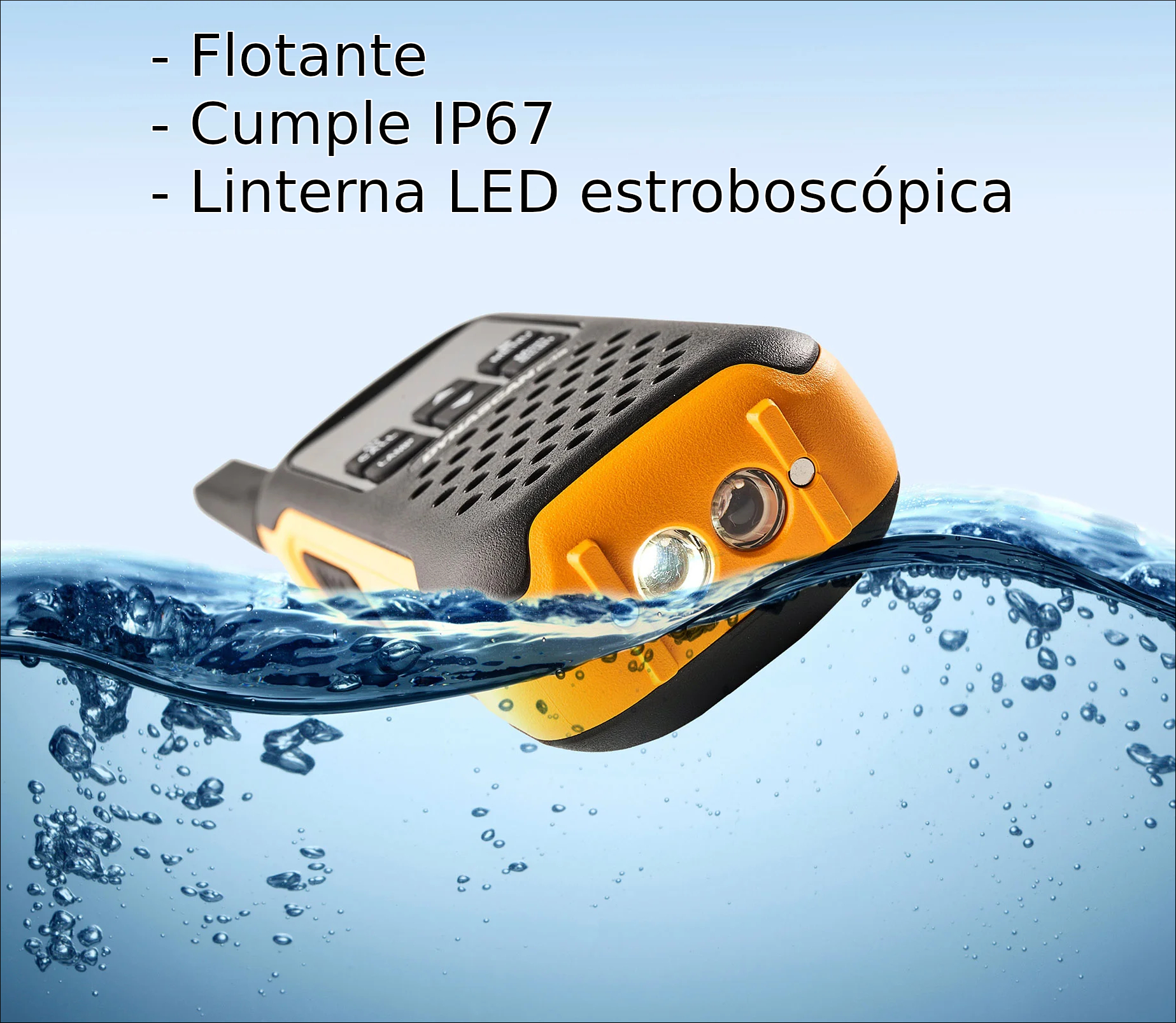 El walkie DYNASCAN F-15 es de uso libre PMR446 de manera que no necesita licencia. Es un equipo robusto, potente, e impermeable, de modo que te mantendrá en contacto incluso en los entornos más extremos. Este walkie talkie no solo flota en el agua, sino que también se pueden sumergir hasta 1 metro durante 30 minutos. Tiene una luz LED integrada y un flash LED blanco que se activa automáticamente cuando entra en contacto con el agua. Además, cuenta con un botón de emergencia muy visible en el lateral que, en caso de alerta, activa una llamada en modo manos libres, a la vez que da un aviso sonoro para informar a tu grupo de que necesitas ayuda.